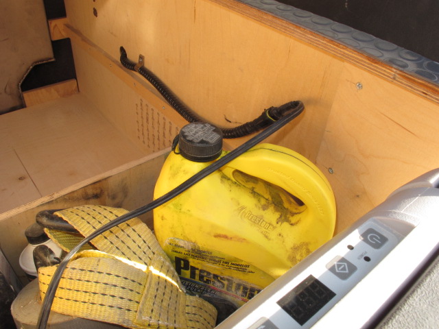 הכבל מגיח מאחורי המושבים האחוריים ומזין קופסת פיצול עם פיוזים שמזינה את המקרר, שקע מצת וקומפרסור.
