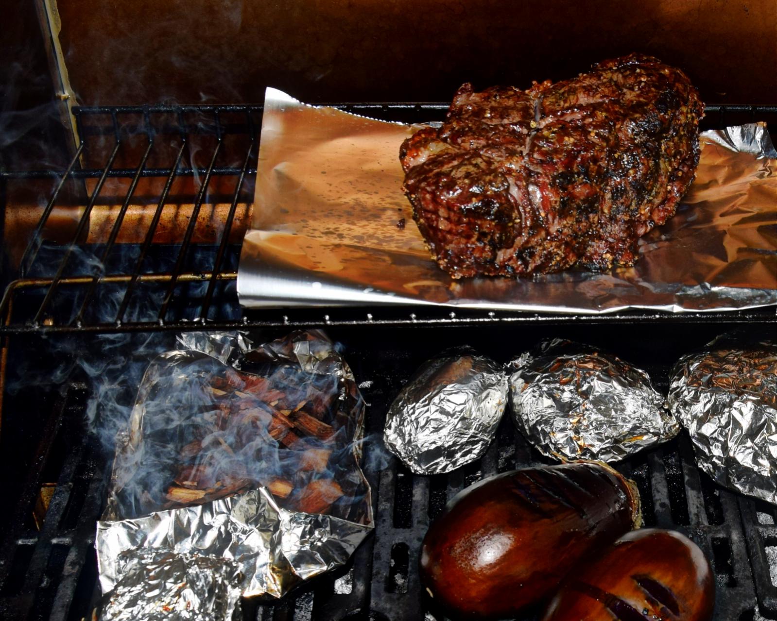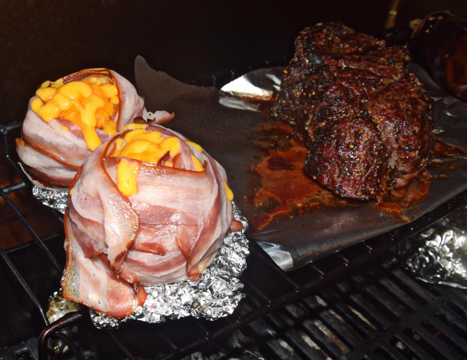 עישון זריז על גריל גז - אנטריקוט 1 קילו ושני פצצות בייקון (תפוח אדמה אפויי מרופת בבייקון וממולא בגבינת צאדר)