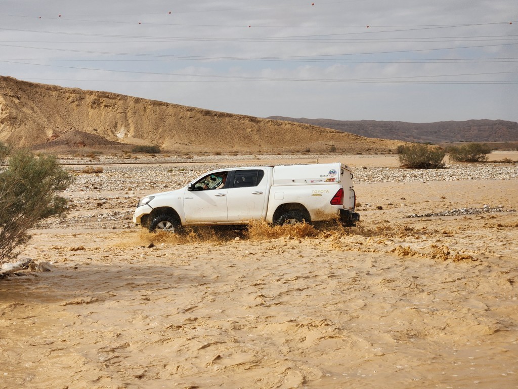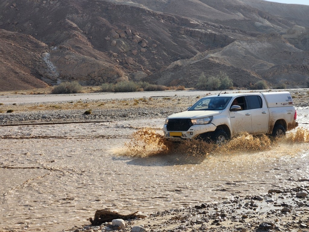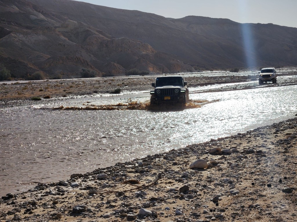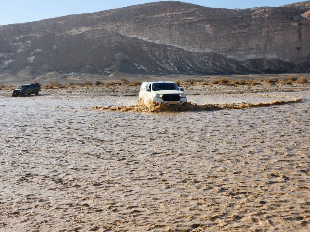 נכנסנו לשטח מזרחה במשאבות, ארוחת בוקר על גדת נהר הפארן ונסיון לחצות ולהתקדם שהסתיים מיד עם היילקס של חבר שהשתנק כשנפל לבור בלתי נראה. פילטר אויר ספוג אבל לשמחתנו המנוע לא שתה מים. סובבנו אותו ביד כמה פעמים כדי לוודא והמשכנו את הנסיעה בלי פילטר - מיותר בהנתן שאבק לא היה לנו בהמשך היום הזה. כדי לא להתמודד עם מיצר פארן חזרנו לכביש, חצינו את הזרימה ונכנסנו שוב בנחל ציחור שכבר לא זרם, ביקרנו בארמון הציחור והתחברנו לפארן מזרחית למיצר. משם התקדמנו לאט עד מושב פארן על כביש הערבה, הרגיש שחצי מהדרך בתוך המים עם כמה וכמה חציות משמעותיות, כאלו שעבדכם הנאמן הפשיל מכנסיים נעל סנדלי שורש ובדק ברגל לפי הספר.