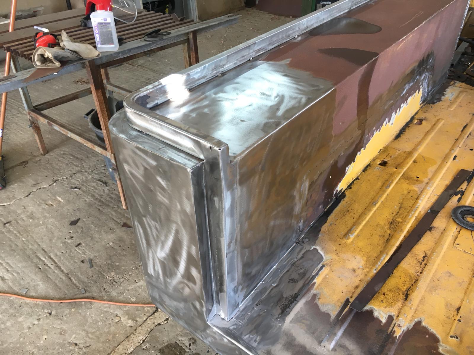 חיתוך שארית הדופן העליונה. בהמשך לשאלה של YoavR - ריתכתי תפר מלא את הצד החיצוני בין הפח לקנט שיושב עליו, השחזתי עד למישור הקנט. בצד השני הפנימי, ריתכתי מקטעים קצרים, השחזתי מעט ובהמשך אמלא את הפינה הזו לכל האורך עם סילר ברדיוס יפה ואחיד (בשאיפה).