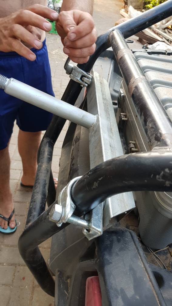 הקושי העיקרי היה למצוא קלמרות במידה של צנרת הכלוב האחורי, אלו נמצאו בשימוש במתקיני תאורות על במות, מכאן היה יותר פשוט להתקדם, אם כי הקלמרה מחייבת בוקסה 21 ממ...עוד כלי לא סטנדרטי לסחוב...הקלמרות האלו מתחברות לכלוב על קורות לא מקבילות, כך שכל העסק יציב ולא יכול להחליק, כאשר מהדקים את הבורג המרכזי עליו יושב הגלגל, הצמיג נוגע בכלוב כך שכל העסק מהודק ולא רוקד.