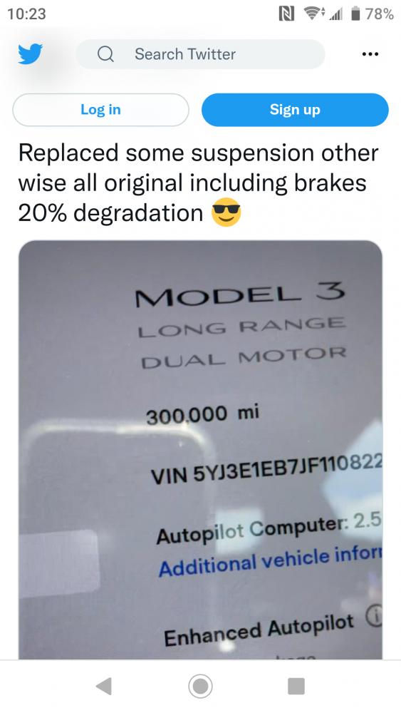 אחד עם טסלה 3 LR מדווח 300000 מייל, החלפת מתלים בלבד ברקסים מקוריים וסוללה 20% דגרציה.