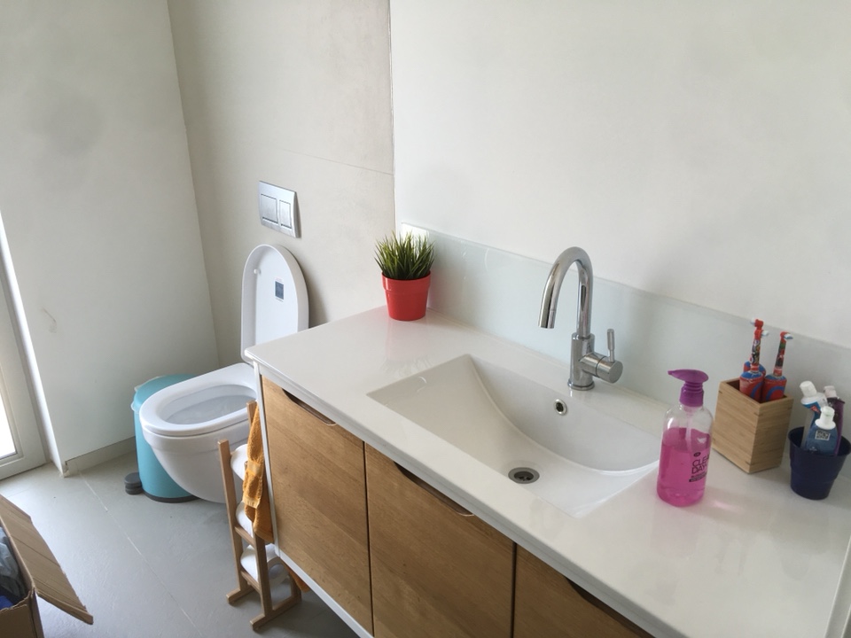 בתמונה של המשטח במטבח, רואים שיש משטח בצורת ר, שבאחת הרגליים שלה יש כיור. שני חלקי ה״ר״ מתחברים אחד לשני בפינה (וזה כי הוראות החיבור לרוב סוגי המשטחים מגדירות שלא כדאי לעשות את החיבור בכיור/כיריים) אפשר לראות (או לא ממש להצליח לראות) את ההדבקה של שני חלקי הפלטה אחד לשני, הבחור שעשה את ההדבקה עשה את זה באמת בצורה מרשימה. לאחר מכן הוא ביצע את ההדבקה של הכיור, וכאן הוא טען שצריך לערבב את הדבק שיש עם סיליקון כדי לקבל הדבקה טובה. היה לי ממש קשה לקבל את הטיעון שלו, אבל אחרי ההתקנה של המשטח החלטתי לתת לו את הקרדיט ולראות מה יהיה.