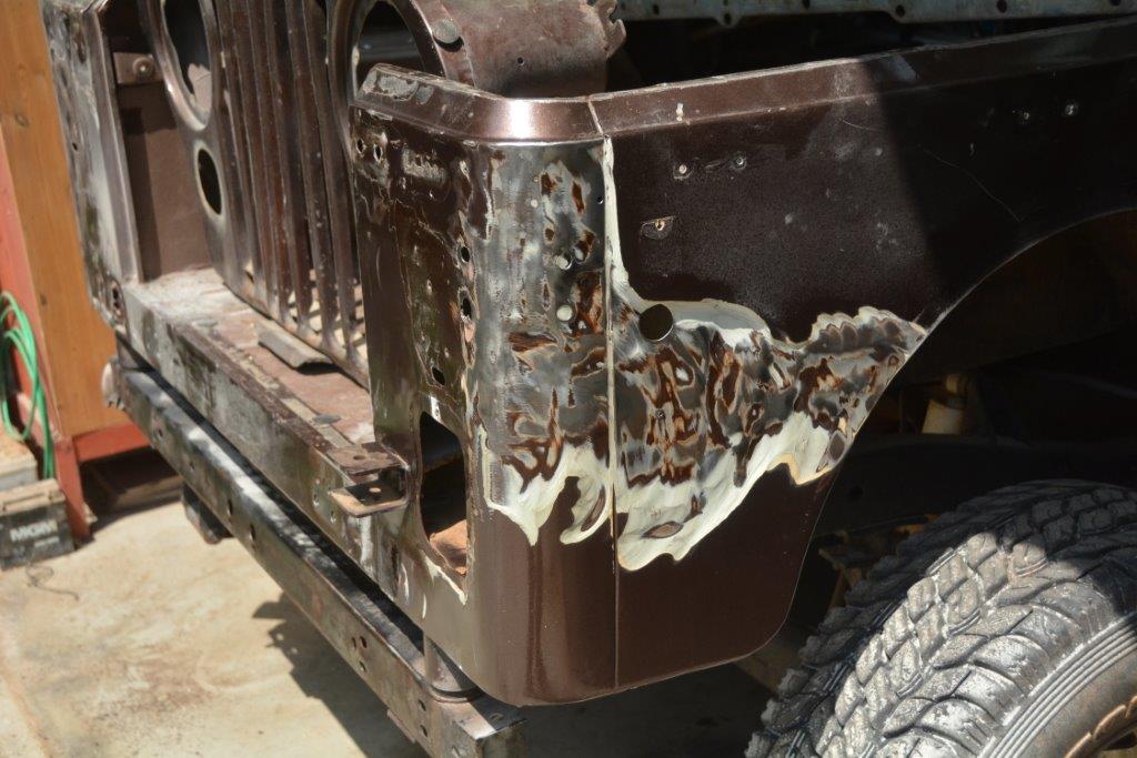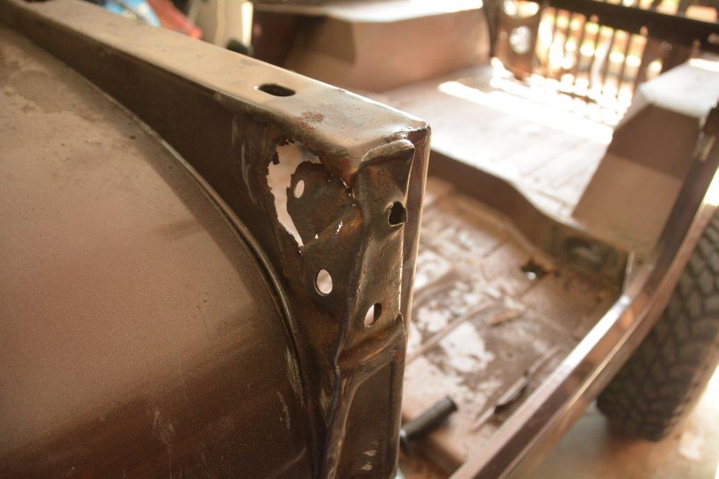 בפינה הימנית אחורית התגלה תיקון פחחות בעובי של כחצי ס"מ - עוד עדות להתהפכות שאני יודע שהג'יפ עבר מתישהו בתחילת שנות ה2000. נראה שאין חורים או חלודה, פשוט טונה של חומר פחחים. פינה אחורית היא חלק זול שאני שוקל להביא במזוודה.