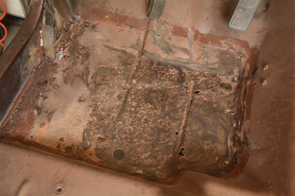 לרגלי הנוסע והנהג הותקנו לוחות פח דקים עם ברגי פח. אחרי שקילפתי אותם גיליתי מתחת מצב פחות גרוע ממה שחששתי.