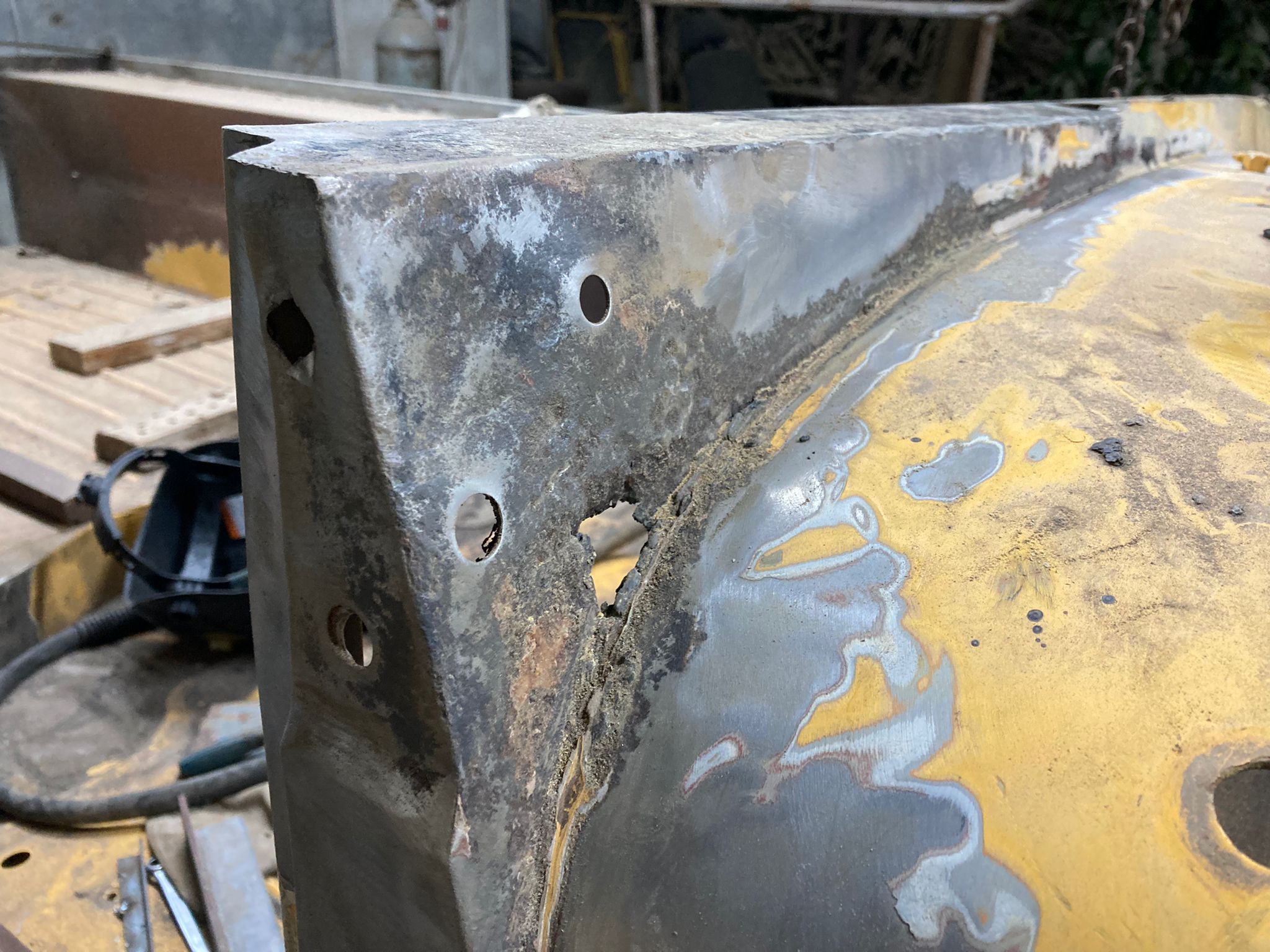בעייתי משהו. החלטתי להתחיל בלפרק את הדופן הכפולה הפנימית והחיצונית ולנסות להבין איך יהיה נכון לתקן שם את הפח. הקושי זה לנקות ולשחזר בצורה נקייה את הממשק עם הרצפה שרקוב לגמרי. אציין ששאר הרצפה נקייה לגמרי, הבעיה מתרכזת בחיבורים עם הדפנות.