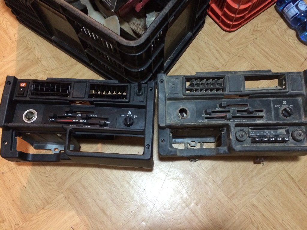 בנוסף, היו לי 2 פאנלי מזגן. זה מימין הוא האחד שהגיע עם הטנדר, את השמאלי מצאתי באי ביי. היה לי ברור שאני הולך עם השמאלי, אך רציתי להתקין את הרדיו המקורי ומישהו החליט לחתוך את כל הפלסטיק – כנראה בשביל להתקין רדיו של גדולים. כבר תכננתי איך אני חותך את התושבת פלסטיק עם החורים שמתאימה לרדיו ומשתיל אותה בחדש.