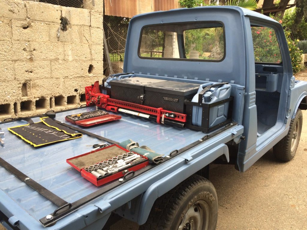 אני מנסה להימנע מקשירת ציוד ל-ווים הקיימים בדלתות הארגז, לכן ריתכתי אל הסרגלים טבעות לקשירת ציוד שנחתכו משרשרת ברזל עבה. הוספתי מתקן להייליפט ו-2 ג'ירקנים.