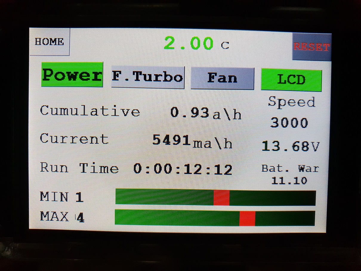 יש פה מידע נוסף ואפשר לראות שבגלל שהמקרר נמצא בבמצב טורבו ( 3000 סל"ד) הוא גם לוקח זרם גבוה (5.5A), המתח של המצבר צרכנים 13.68V וההתראה של המצבר הזה מכוונת ל 11.1V. אפשר גם לראות שהמקרר צרך 0.93AH מההדלקה שלו (ניתן לאפס בכפתור reset האדום).