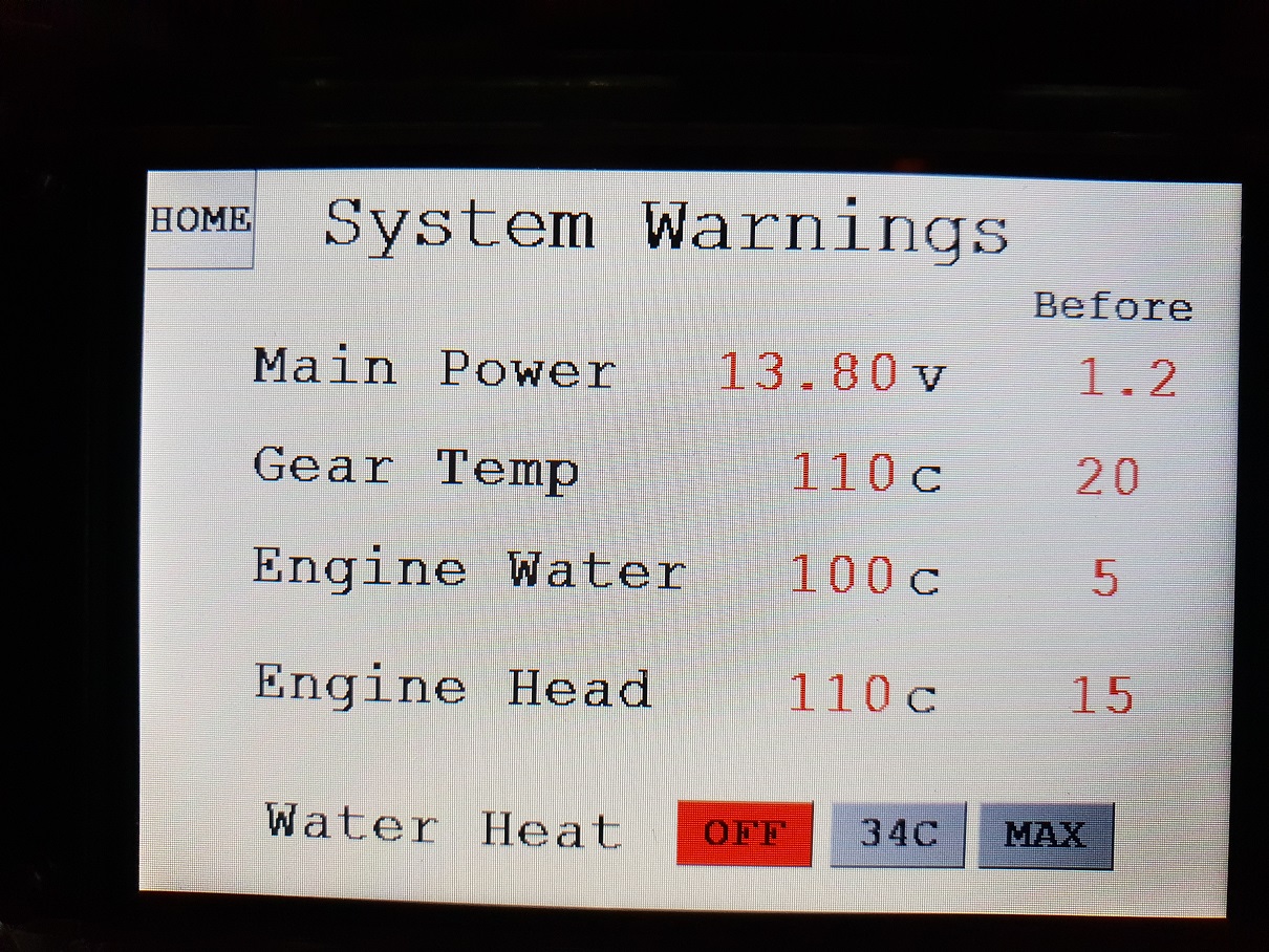 החלק הימני מייצג את המקרר, האמצעי לחצים וטמפ' בגלגלים ובכריות אוויר שיש לי מאחור, השמאלי, התרעות כלליות - מתח מצבר, טמפ' גיר, טמפ' מים בראדיאטור, טמפ' ראש מנוע, וטמפ' במיכל מים (של המקלחת).