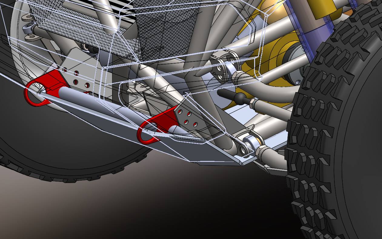 בכל אופן אצלנו התכנון מתמקד במספר דברים, חיזוק הפינה התחתונה של השלדה כאשר "אוזן" הגרירה עצמה היא חלק יעודי של ספארקו(באדום) ומיועד לקרוס במקרה חמור של נחיתה על האף(שתילה) ולא לשמש יתד שתהפוך את הרכב.