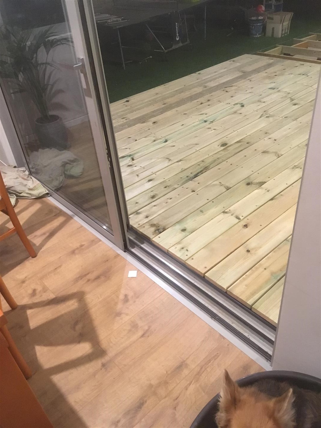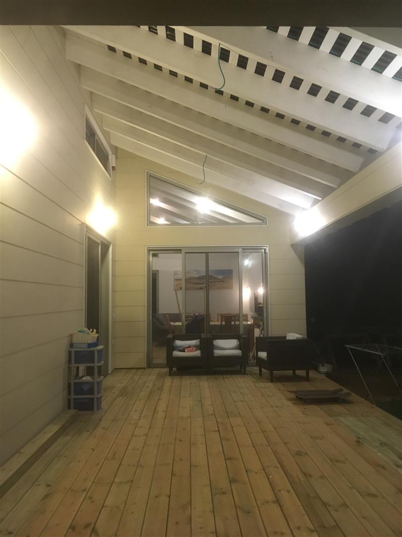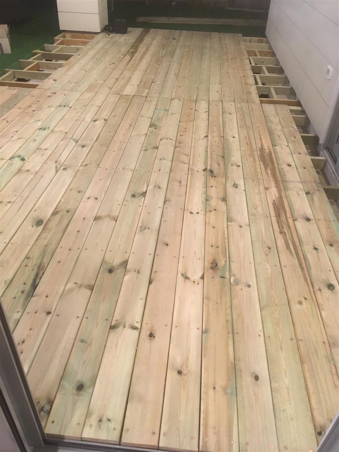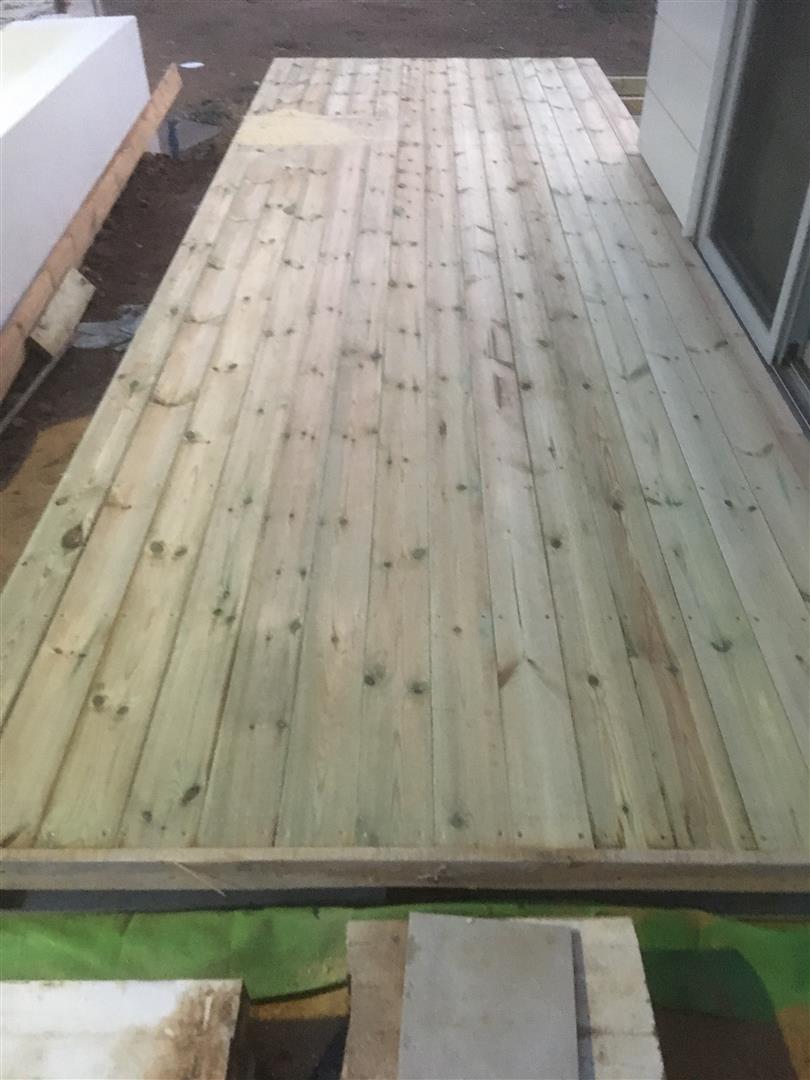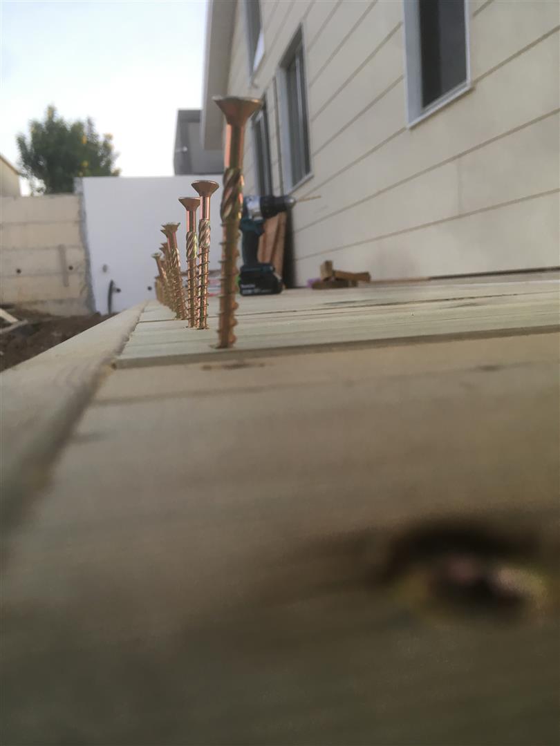 התשתית של הדק נבנתה מקורות עץ אורן 5X10 מחוטא, ובהמשך עברתי לעץ מהוקצע ומחוטא שגיליתי שהרבה יותר נוח לעבוד איתו וההבדל בעלויות לא בשמים. את קורות התשתית הנחתי במרווחים של 50 ס"מ אחת מהשניה וכל מטר בערך שמתי קורת חיזוק בין כל שתי קורות תשתית למניעת קבלת "בטן" בקורות התשתית לפני הנחת המדרכים. את התשתית חיברתי עם ברגי סיבית 5X80 ולבסוף הנחתי את המדרכים, עץ דק אורן מחוטא (וזול באופן משמעותי ביחס לאחיו היפים יותר כמו איפה טיק ושות' וגם חוסך המון זמן בהרכבה) וחיברתי אותם לתשתית עם ברגי טורקס טורבו או איך שלא קוראים להם, הייתרון שהם ברגים שלא מצריכים לבצע קידוח מקדים ושיקוע (שוב, רלוונטי רק כשעובדים עם אורן, בעץ קשה אין איך לברוח מהעבודה) הגובה של הדק זהה לגובה הריצוף בתוך הבית כך שמתקבל משטח אחד בין הפרקט בבית לדק בחוץ.
