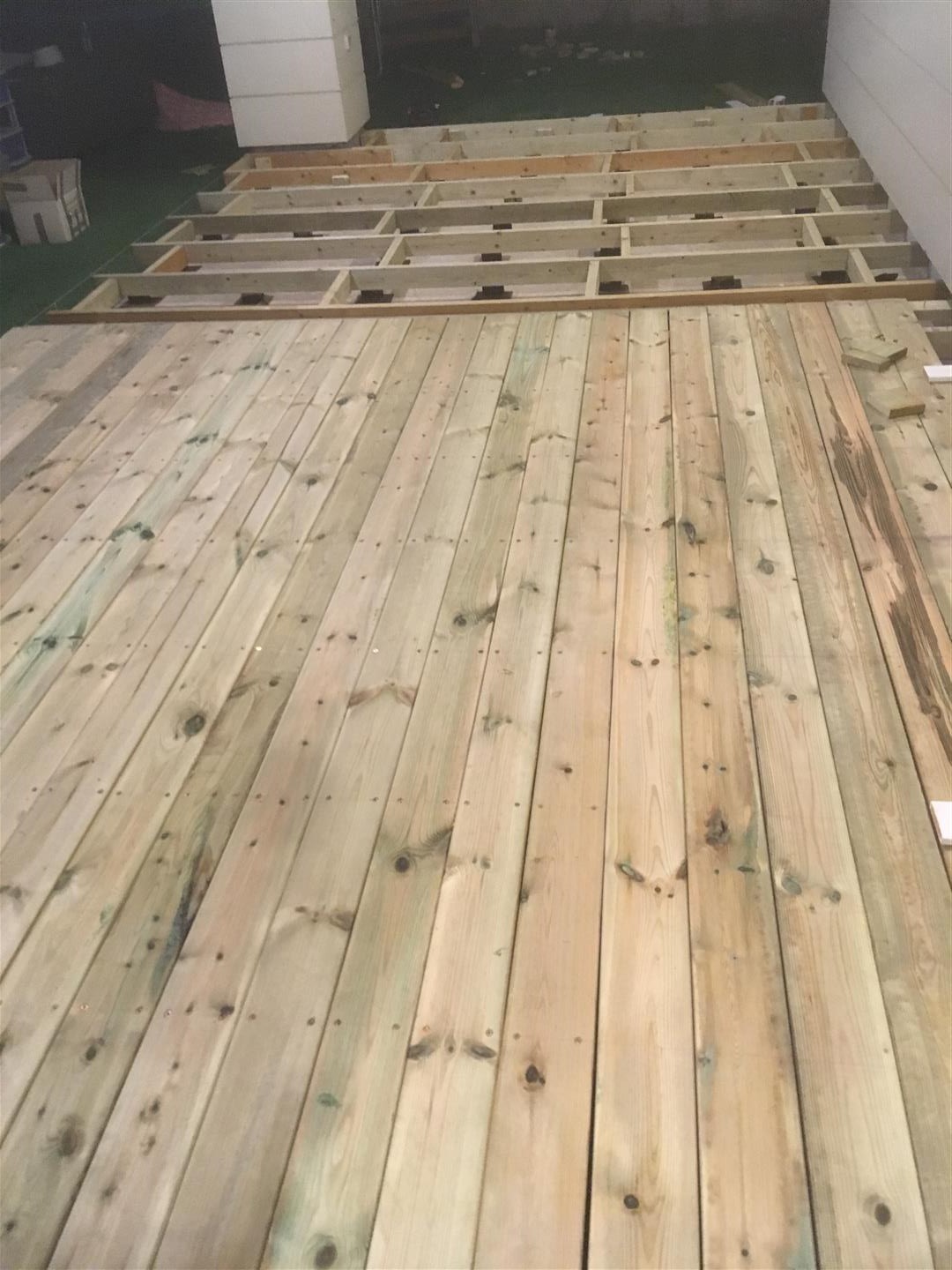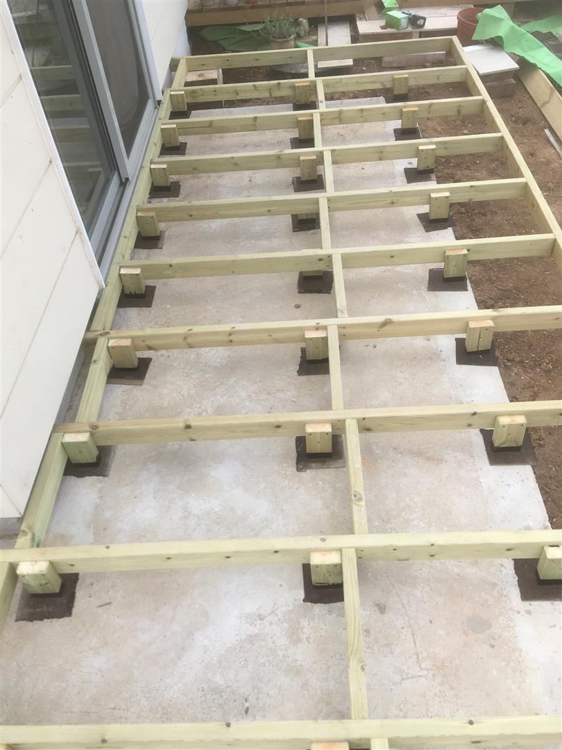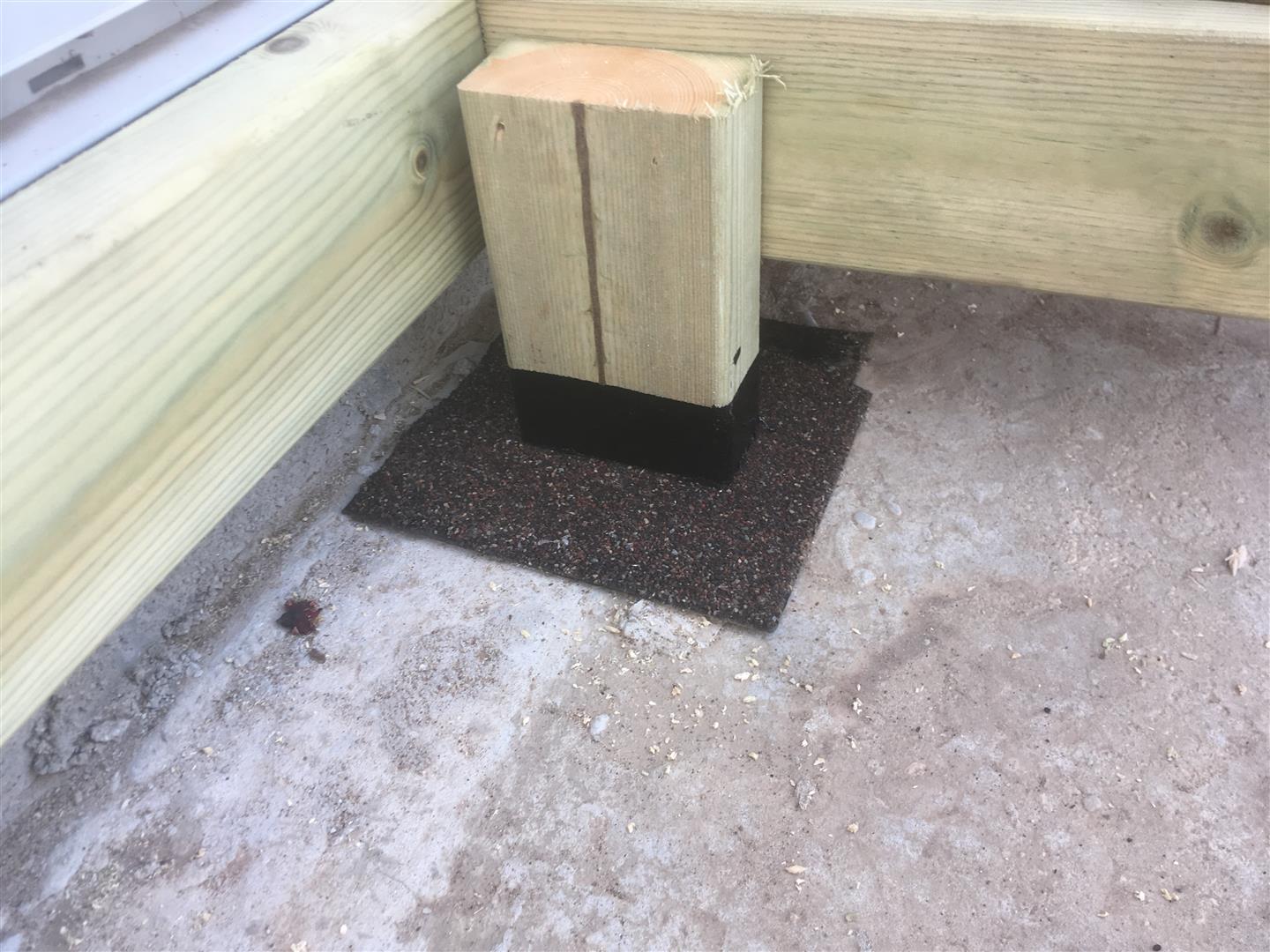 בגלל שהדקים מותקנים על גבי משטחים של בטון ייצוק, לא הייתה לי עבודה בתהליך הביסוס של הדק, אלא הדק פשוט מונח על גבי משטחי הבטון, כן הייתי צריך לדאוג לאיטום של הרגלים ולכן כל רגל נטבלה בזפת נוזלית ואז שמתי מתחתיה גם חתיכה של יריעת זפת (שינגל חתוך) למניעת מעבר של לחות מהבטון לעץ את הרגלים עשמן שמתי במרחקים של חצי מטר אחת מהשנייה בערך.