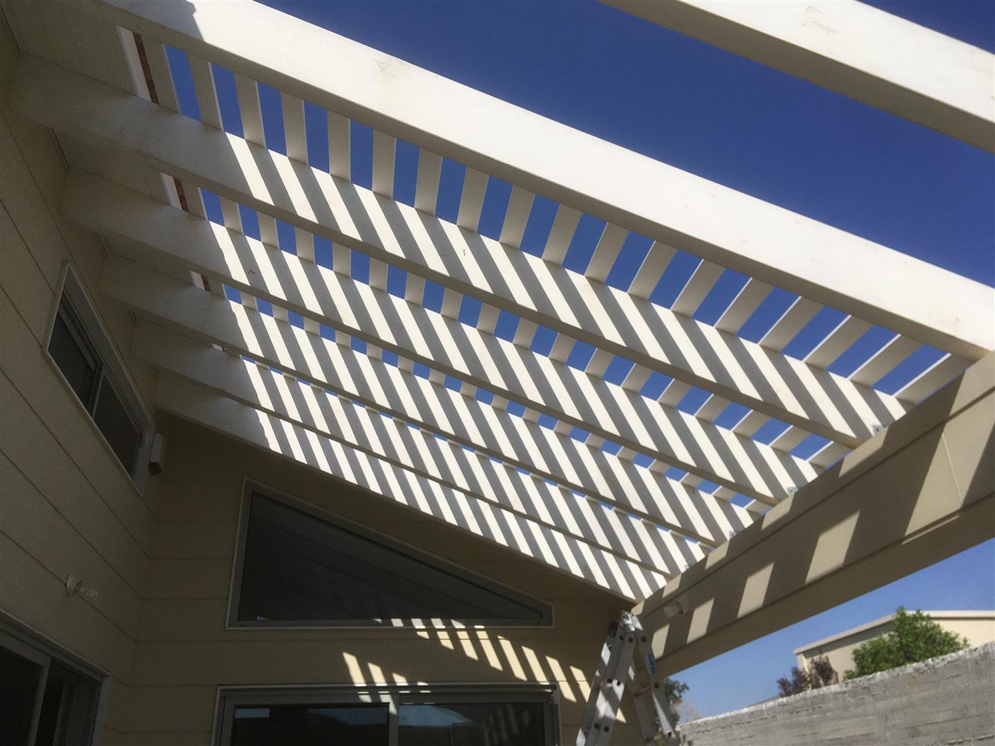 התקנת ההצצלה בפרגולה (מצללה) - קורות עץ, 2X10, שנצבעו בצבע לבן מעקב בעירה והותקנו במרווחים שנותנים 40% צל.