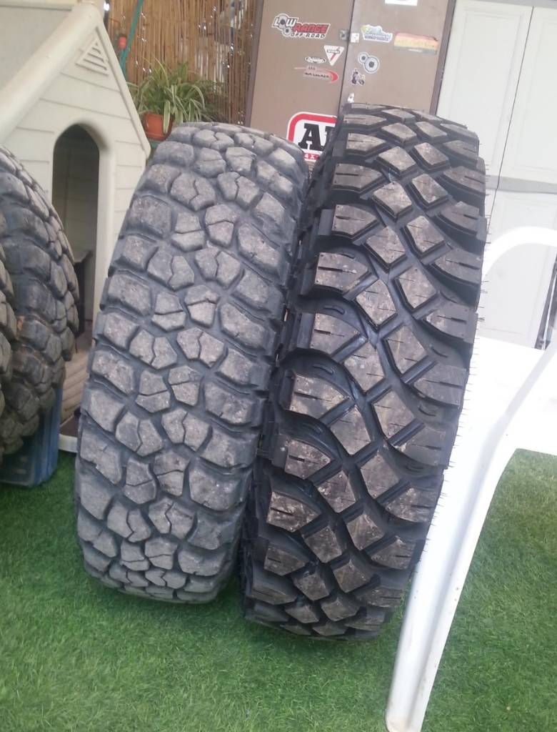 הצמיגים הם מ-34/18 . מצ"ב תצלום של 2 סוגי צמיגים ניצבים אחד מעל השני . אני הזמנתי מהיבואן את הדוגמה התחתונה . הגיעה העליונה . אין קוביות ( שיתלשו/יתפרקו ) אלא פרוסות רוחביות/שברון/CHEVRON . נסעתי אתם בדרום , חצבה/סובב , מעלה הנחש הצמא , ירדו את זיק , משלט 21 , ומעלה יאיר . כשהתבצעה הפחתת לחץ אויר ל-10-15psi , נתנו אחיזה יפה ומעלה , ללא פרפורים. בטיול בדרום נסעתי בתחילה 2x4 LOW כדי לבדוק את האחיזה שלהם . הייתה טובה עד שהפסקתי עם זה כי כאב לי להפעיל את כל המאמץ על הגל הינע אחורי/ביצה אחורית/ציריות אחוריות . אני גם הרגשתי אבל גם אחיין שלי שעבר לטנדר סמוראי עם BF M/T OR A/T אמר לי שבזמן שה-BF פרפרו קצת ה- CHEVRON נשארו צמודים לקרקע.