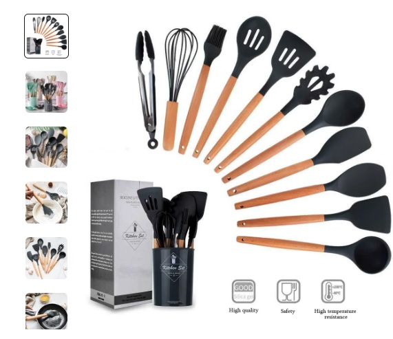 12PCS Silicone Kitchenware Non-Stick Cookware Kitchen Utensils Set Spatula Shovel Egg Beaters Wooden Handle Cooking Tool Set