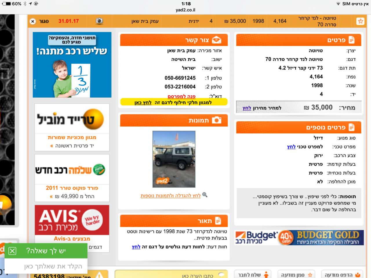 מצד שני כתוב גם "דרוש שיפוץ קוסמטי" ו"פרויקט מעניין" - ובשפת הג'יפאים וזה רמז עבה שהאוטו שחוט ודרושה הוצאה גדולה. כי פחחות וצבע אצל בעל מקצוע זה סיפור לא זול, וגם להשיג חלקי פלסטיקה, ריהוט פנימי מקורי וחשמל למיניו יכול להיות משימה סיזיפית ויקרה.