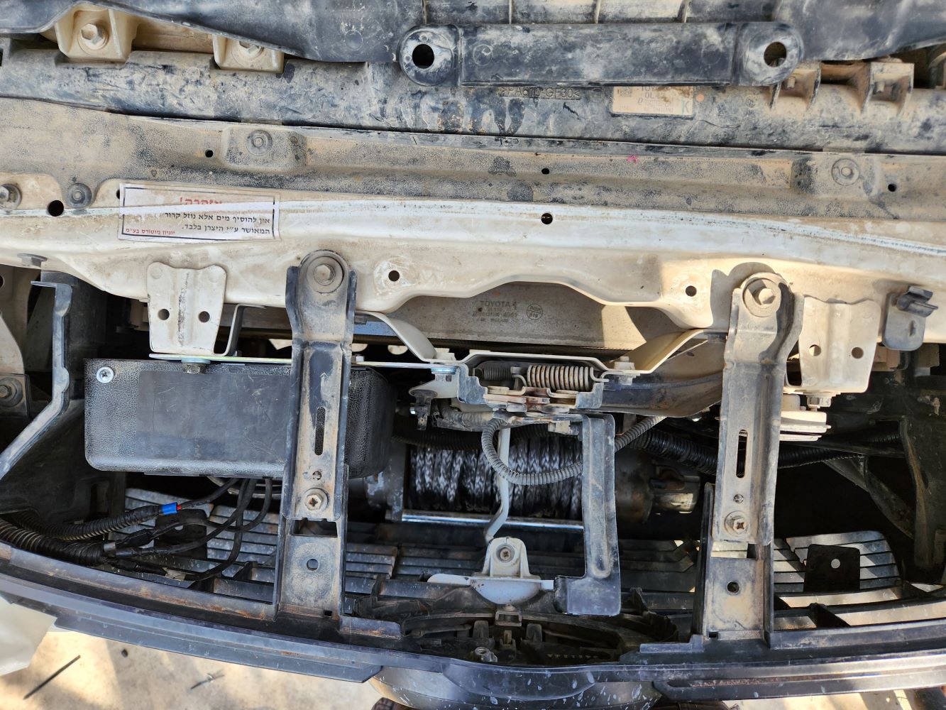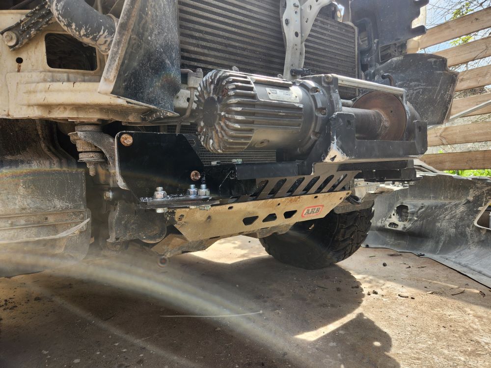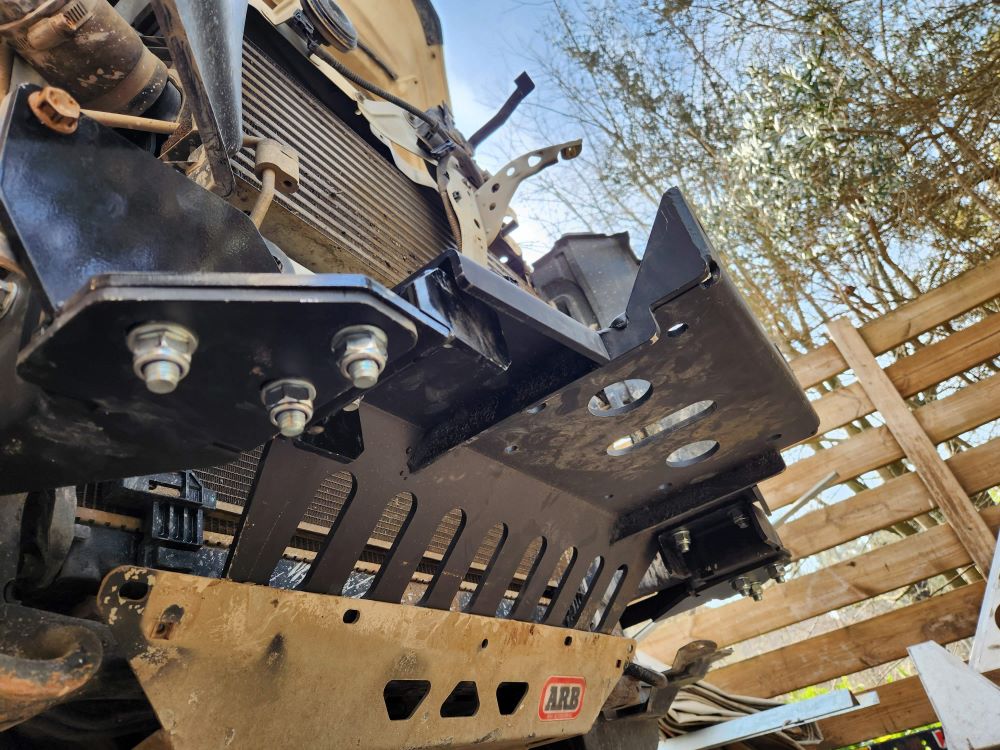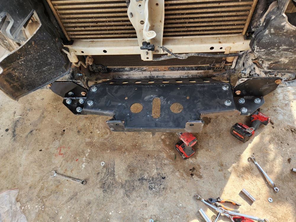 פרוק הפגוש כליל המקורי קליל, יש הוראות וסרטוני יוטיוב רבים. הרכבת המגש קלה - המגש מתחבר עם ברגים לחורים מקוריים בשלדה, לא צריך לקדוח או לגעת בשלדה בכלל. נתקלתי בבעייה של ממשק עם מיגון ARB שמותקן אצלי, שהתחרה על כמה מהחורים עם המגש שבא עם פלטת מיגון בילט-אין. זה אילץ אותי להשתמש בדיסק פעם ראשונה אבל בקטנה . בעייה רצינית יותר הייתה עם הממשק של חזית המתקן עם הפגוש. זה איפה שההתקנה מתחילה להסתבך ואני מניח שלסדנא שעשתה את העבודה כמה פעמים הבעיות ידועות מראש. לא צילמתי יותר מדי כי אכלתי לא מעט חרא. אני בסופו של דבר קדחתי חורים חדשים שהזיזו את הכננת 17 מ"מ אחורה יותר מאשר המקוריים, וקיצרתי את האף של המגש ב20 מ"מ על ידי חיתוך וריתוך מחדש. אני מניח שזה לא הכרחי אבל רציתי חור מינימלי לfairlead. יתכן שפתח מלבני גדול שיתן לכל האף של המגש לבלוט קדימה היה אפשרי ואולי זו כוונת מי שתכנן את המגש. בכל מקרה, אחרי שמסדרים את עניין הפגוש כולל החור לfairlead, שאר העבודה ישירה יותר.