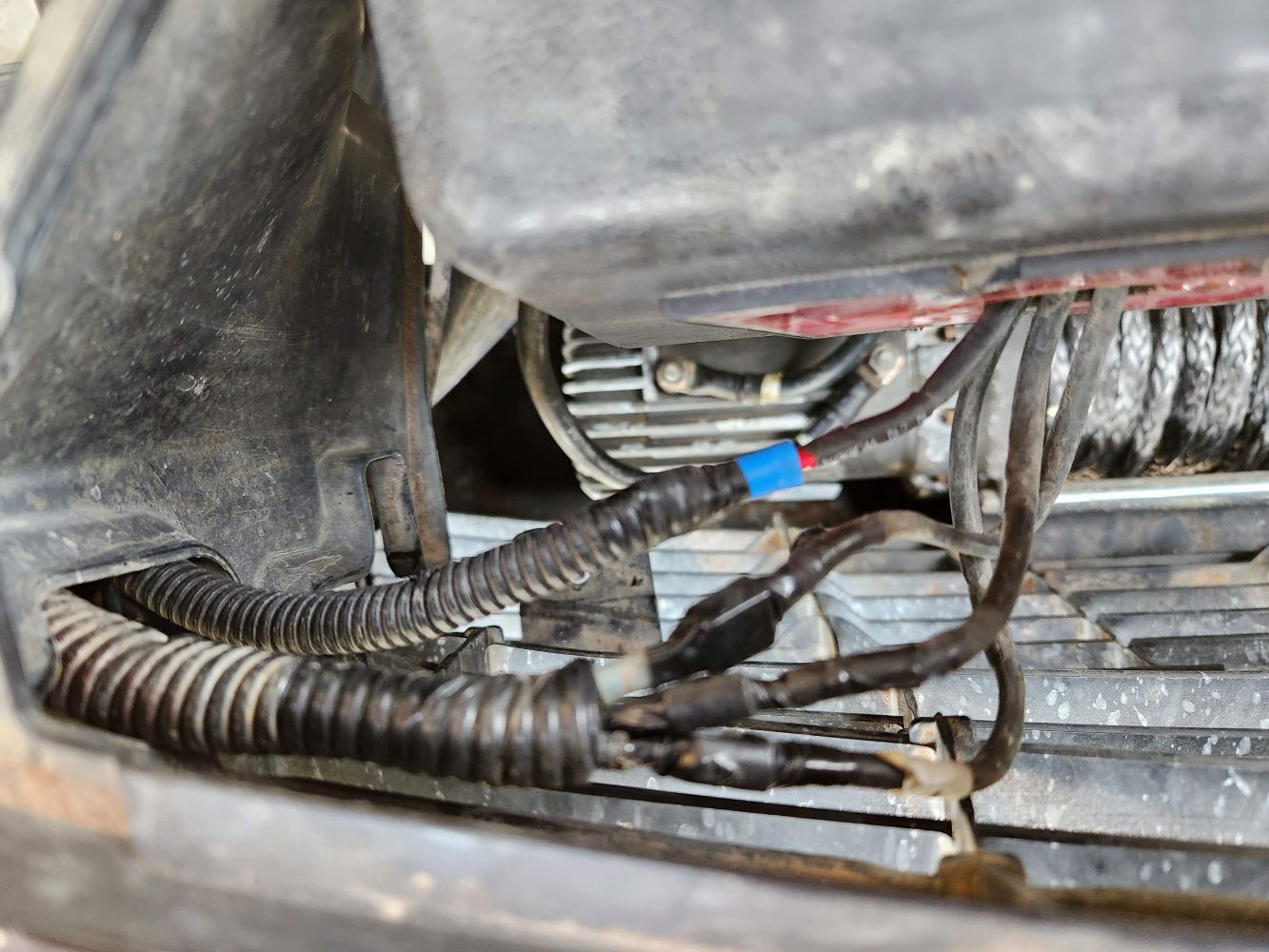 יש כאמור הרבה מקום לכננת, ויש מקום נוח גם לקופסת הפיקוד. אלתרתי פלח שיחבר אותה לשני הברגות מקוריות במרכב, אחרי שהזזתי את הצופר מצד נוסע לצד נהג. את הכבלים העבים של הזרם הגבוה העברתי מאחורי הפנס השמאלי של הרכב למצבר. על כבל הפלוס הוספתי הגנה של שרשורי וגם מגה-פיוז 400 אמפר, למקרה של קצר בתאונה חזיתית.