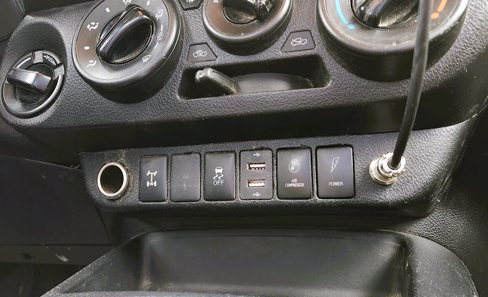 בכל מקרה, הפיניש האחרון שהגיע לפני שבוע זה מתג בגודל תקני להפעלת הפיקוד של הכננת. למי שמחפש, הגודל הנכון להיילקס דור 8 כמו שלי הוא 1.28" על 0.87". זה שונה משל היילקס ישן יותר. כל מתג כזה עולה בערך 10$, שווה בשביל המראה המסודר בקבינה. לא מצאתי כזה שכתוב עליו winch, אז Power מספיק טוב. לצידו מתג זהה שמפעיל את הקומפרסור. נשאר מקום לעוד אקססורי אחד.