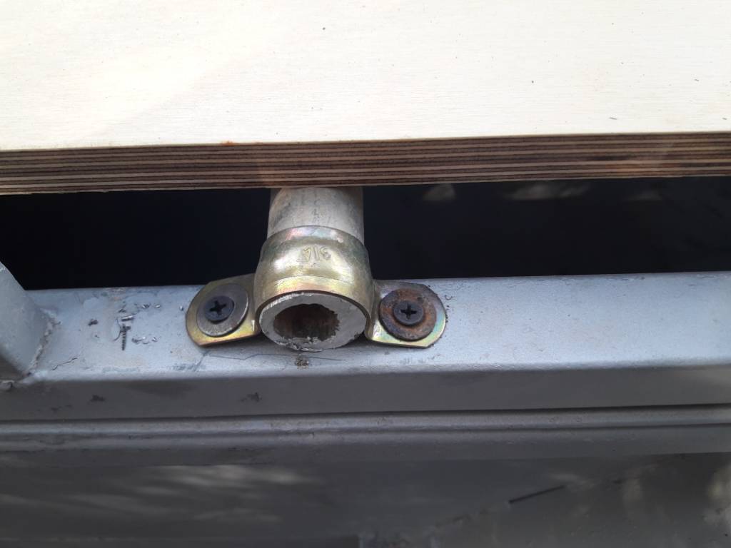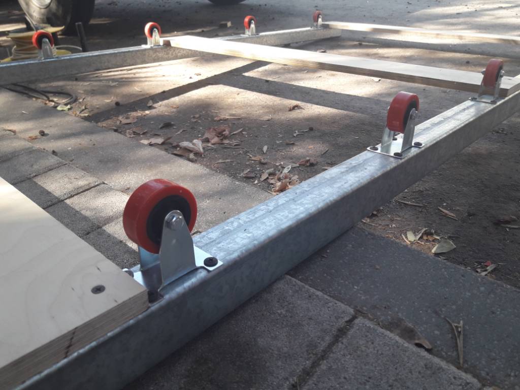 לעשות את הסיפור ארוך, התחלתי לבנות: מחיצה בגובה ה"אמבטיה" שמעליה יהיו ארונות למטבח, מים, מזרונים, כסאות, לוח חשמל, ושאר הציוד בתפזורת. מתחת למחיצה נבנתה המגירה הגדולה (2×1 מטרים כגודל רצפת הנגרר). המחיצה עשויה מדיקט 17 מ"מ (בירץ'?) שמונח על צינורות אלומיניום בקוטר 3/4. המחיצה חזקה מאד ואין בעיה להעמיס עליה מאות ק"ג. במגירה צפוי היה להיות מאוחסן הציוד הכבד יותר, שולחנות, ברזלים שונים, ועוד. בפועל החלוקה המשקלית הסופית לא בדיוק נכונה אבל זה לא באמת משמעותי מבחינתי, הנוחות יותר חשובה. אז הדברים הגדולים נמצאים במגירה.