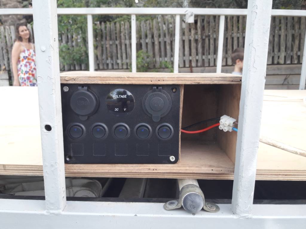 אז הותקנו חשמל ומשאבת מים, החשמל מגיע ללוח מהרכב עצמו שבו יש מצבר צרכנים 95ah ושנאי גם ל-220v. הנגרר מקבל רק 12v. נתפר כיסוי ברזנט שמכסה הכל. הכחול בתמונה זה מיכל המים הגמיש ש"מוטמן" בנגרר, יש צינור שממנו ממלאים אותו ועוד צינור נשם. סה"כ יש בנגרר 150 ליטר מים.