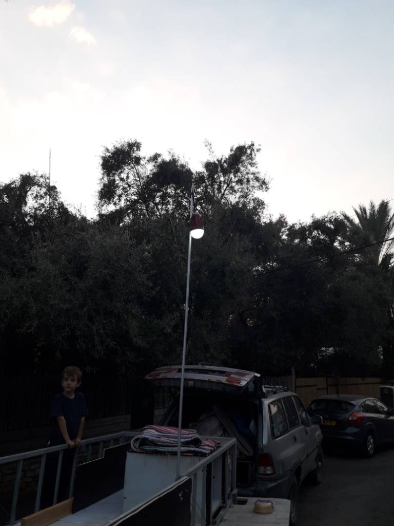 בעניין התאורה יש לי גרילנדה של 10 נורות מאמאזון ועוד כמה מנורות נטענות, בפועל אני כמעט לא משתמש, זה יותר מדי תאורה בשבילי. יש לי גם תורן דק מתקפל מאלומיניום שעליו אני יכול לתלות מנורה הנה בתמונה המצורפת. יש לי מקרר 50 ליטר ועם התאורה, המשאבת מים, טעינות טלפונים, כבר יצא לי לשבת באותו מקום 70 שעות והמצבר לא התרוקן. אבל זה לא היה בקיץ.