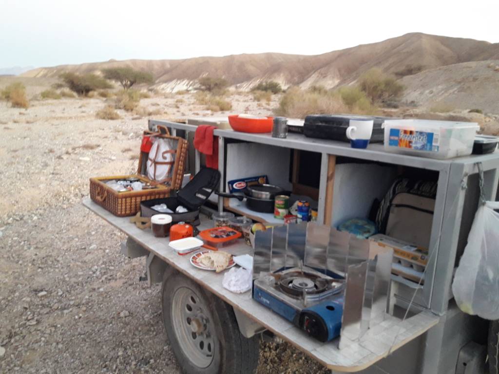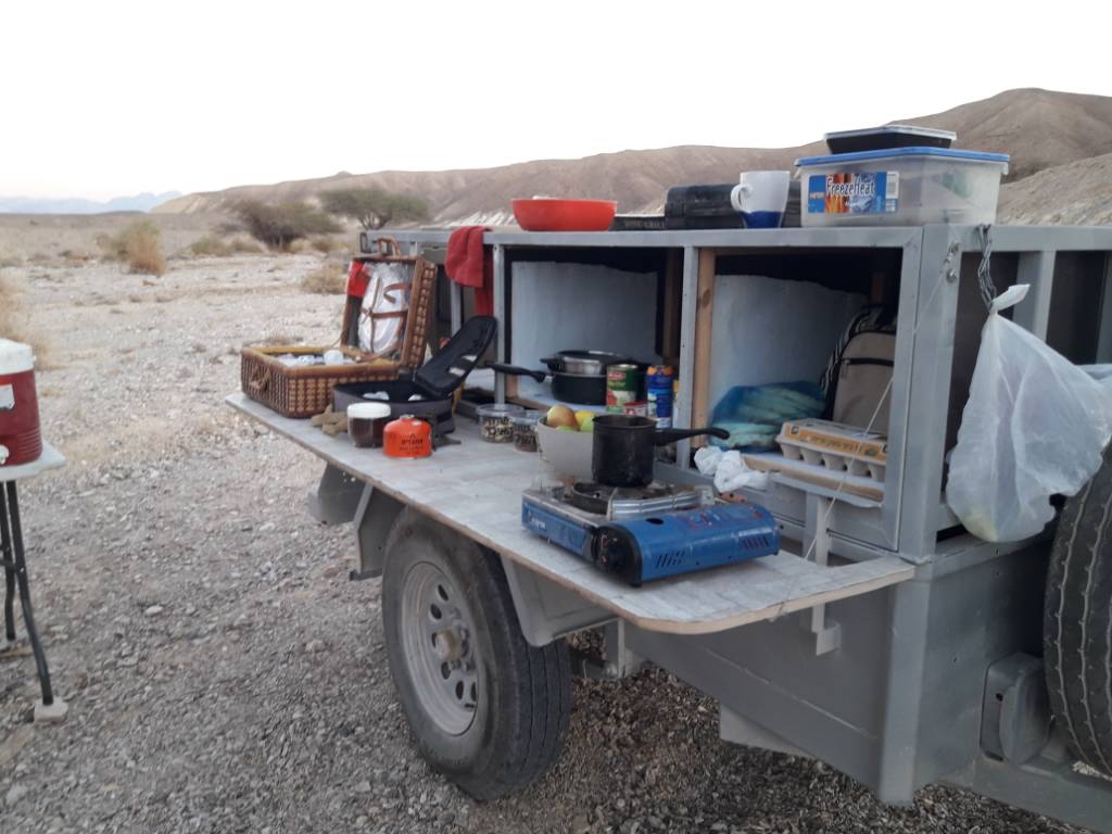 בנוסף נבנתה דלת אחורית חזקה ועלי הותקן שולחן מתקפל. בצד הארונות (צד ימין של הנגרר) הותקן עוד דיקט שמשמש כמטבח.