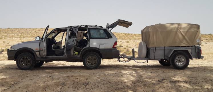 הנגרר פחות אוהב חולות, הצמיגים די צרים, בקוטר הם בדיוק כמו של המוסו (29"). צריך להוריד אוויר בצירים חוליים אחרת האוטו אוכל קש. שקלתי לשדרג לצמיגים במידה של המוסו ואז גם להרוויח את הרוחב וגם את היכולת להשתמש בספייר אחד גם לרכב ןגם לנגרר, אבל ויתרתי כי אני לא באמת צריך.
