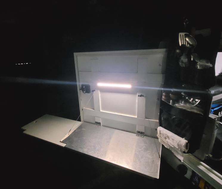מחיצת עץ פשוטה, מעליה ציוד שינה קל, ממתחת מעוגן שולחן שנשלף בקלות גם כשהארגז עמוס.. שולחן בדכ נשלף ראשון ועולה אחרון לכן זה שיפצור חשוב לטעמי, וממול ברצועה פשוטה ניתן להצמיד ציוד קל לגג מבפנים.