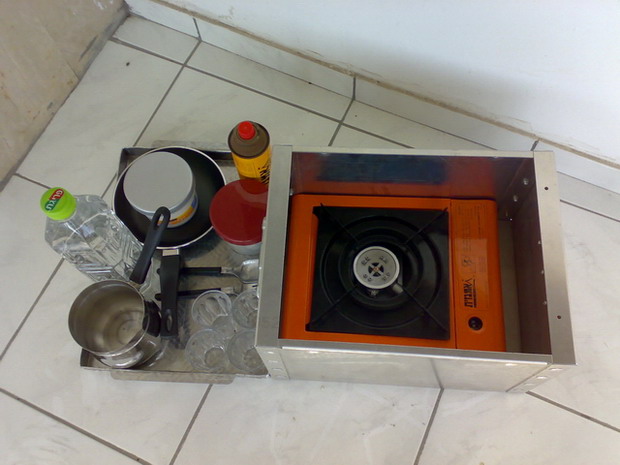 הבישול מתוכנן להיעשות בתוך הארגז - (מפח מגולוון וצבוע אפוקסי) - כשהוא מוגן רוח מארבעת צדדיו.הגזיה הזו מאוד חזקה וחסרונה היחיד הינו צריכת גז לא קטנה. אבל זה הכסף הקטן שבהפעלתה.בינתיים חשבנו לקרוא למוצר ''ערכת קפה ובישול שטח''. לצורך כך הוספנו וגרענו מספר דברים ,והערכה כוללת עכשו את הפריטים הבאים. גזיה שטוחה עם בקבוק גז. בקבוק גז רזרבי. פינגא'ן נירוסטה עם בסיס רחב. מחבת טפלון בינוני.4 כוסות קפה דורלקס. 2 צנצנות פלסטיק מתברגות לקפה וסוכר.לארגז יש שתי ידיות גומי קפיציות לנוחיות השינוע, והמכסה המשמש כמגש או משטח עבודה.נותר מקום רב להכנסת צנצנות תבלינים, סכו''ם, צלחות פלסטיק,קופסת צנימים או פירות יבשים,שימורי טונה, בקבוקון שמן ,ושישית ביצים.מחירי העלות לחברתנו 389.45 ש''ח. בכדי להריץ את הפרויקט אנו מוכנים לספק לחברי האתר בלבד 10 ערכות ראשונות במחיר -.400 (בתוספת מ.ע.מ) לנרשמים כאן.אספקה - עד סוף החודש. אולי יהיו תמונות בהמשך.