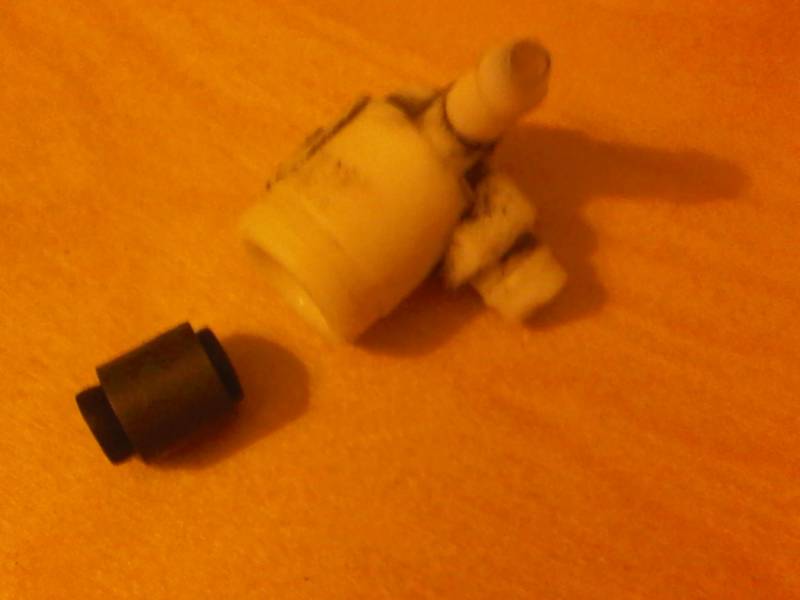 שלב שני - פירקתי את בית השסתום לשני חלקיו (שחור ולבן), ומצאתי בתוכו את הטובלן. מתברר שהגומי של הטובלן התנפח, וכך הוא סוגר בו זמנית את שני הצדדים בלי יכולת לזוז. סכין יפני חתך פרוסה עבה של גומי מכל צד, והטובלן חזר למקומו.