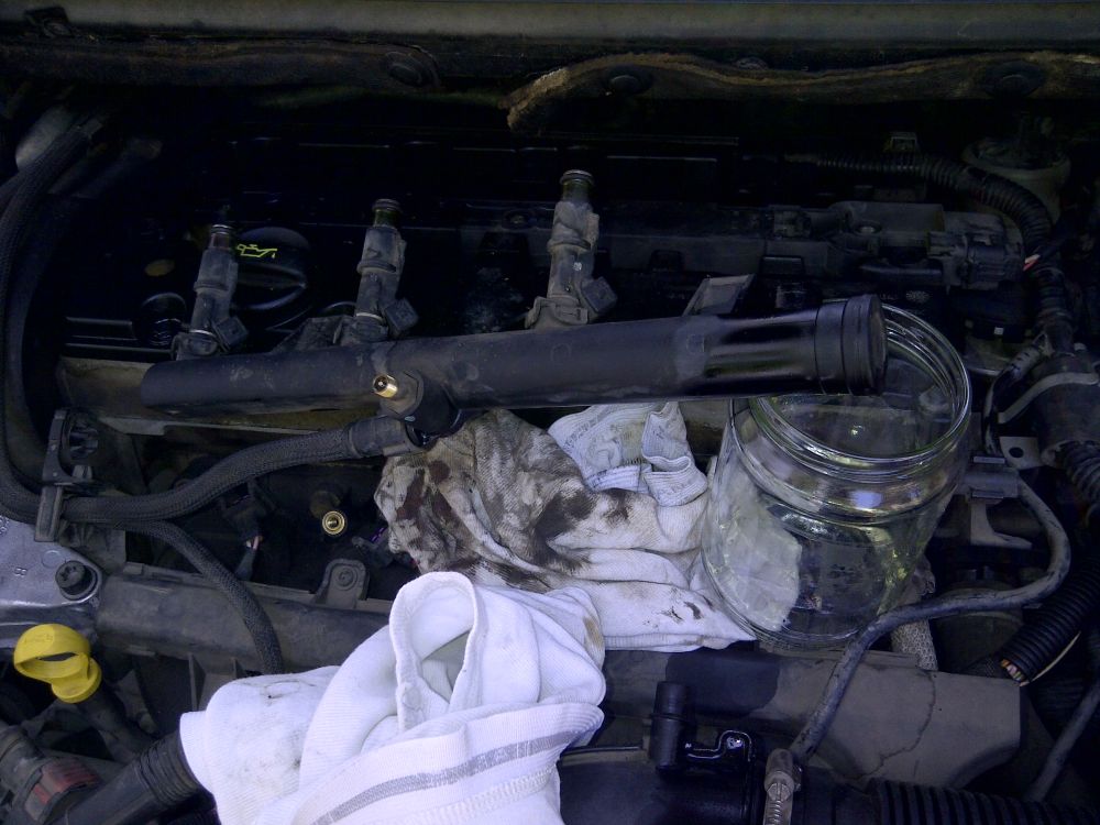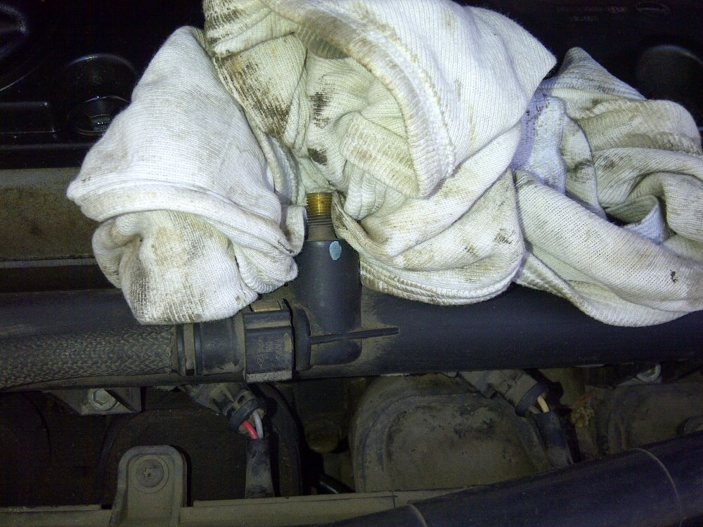 אחרי זה פורקים לחץ מהחליל, על ידי פתיחת המכסה ולחיצה על הונטיל. אם הייתי בנאדם רציני הייתי מחבר צינורית מיוחדת ובעזרתה נפטר מהדלק העודף. אבל אני לא, אז אני משפריץ את הדלק על סמרטוט שיספוג אותו.
