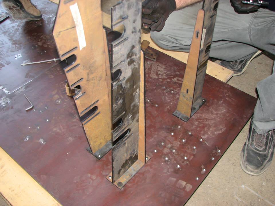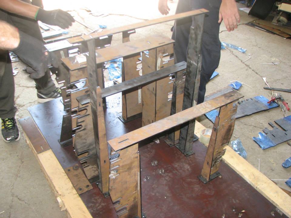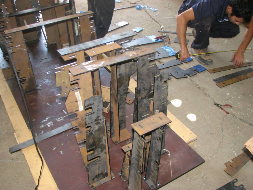 שלב 2: הרכבת ג'יג על הרצפה. 3 פלטות 70X70 ס"מ עם בערך 170 חורים חתוכים בלייזר שאחר כך הגדלנו והברזנו ידנית. מי אמר שסטודנטים להנדסה לא מבריזים אף פעם??. על זה מתברגים מגדלים שבנויים מסטים של פלטות מרותכות. זה בערך 40 מגדלים שעשויים מאיזה 200 חלקים.