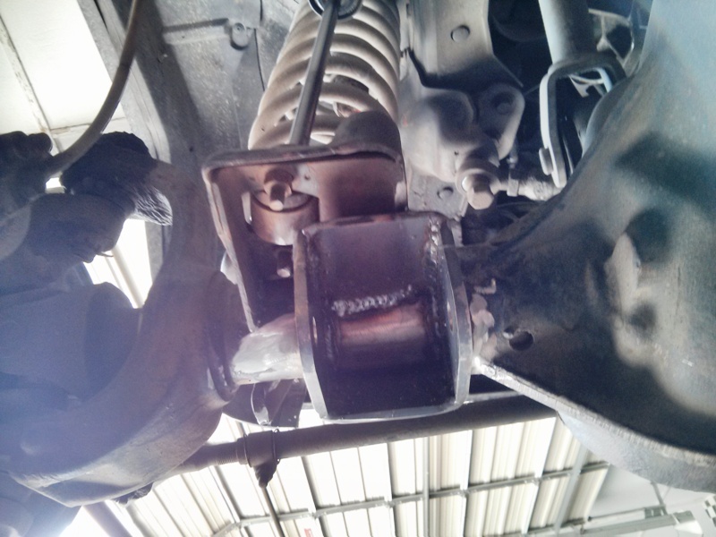 תושבות הזרועות התחתונות בסרן הקדמי מתעקמות. ידוע. אם זה לא המצב בג'יפ שלכם אתם לא נוסעים בשטח. אבל יש עקום ויש "אחי הג'יפ שלך באמת מוזנח". תושבת צד הנוסע אצלי הגיע למצב חמור באמת - הזרועה זזה למטה ושמאל כבר לא במ"מ אלא בס"מ שלמים (אולי אפילו אינצ'ים...), וסדק בריא כבר התחיל להתפתח (לא רואים בתמונה הזאת, בצד שני) שהצביע על כך שיש כאן סכנה אמיתית לתלישה במכה הקשה הבאה.