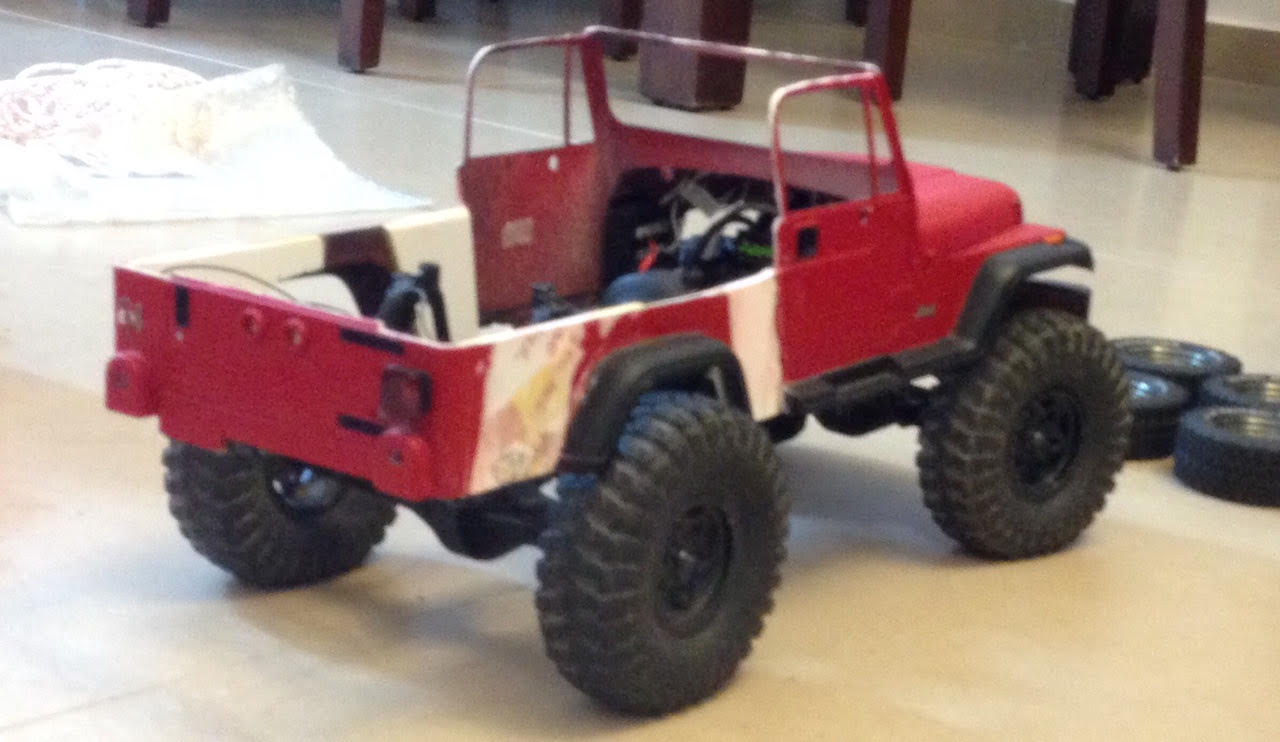 הבודי של רנגלר YJ תוצרת TAMIYA. כמו שאתם רואים, קניתי יד שנייה. כלומר - ממישהו שכבר טרח והרכיב וצבע אותו (ברמה גבוהה מאוד. הקיט מגיע מהיצרן בצבע לבן). בחבילה היו גם שני סטים של גלגלים וצמיגים שאתם רואים כאן והם לא ממש מתאימים למה שאני רוצה. גם הצמיגים של טאמיה קשים ולא אוחזים כלום.