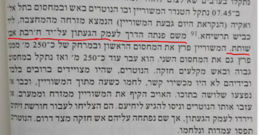 3. מפקד המשוריין מתאר תנועה בשטח מת בואדי, עליה על גבעה וממנה ירידה לתןך אפיק הגעתון, שם הם מנהלים קרב. יש שם באיזור מספר תחנות קמח/סכרים/חירבות שהיו יכולים לשמש אותו כמחסה, אז למה הוא נלחם מתוך הערוץ?