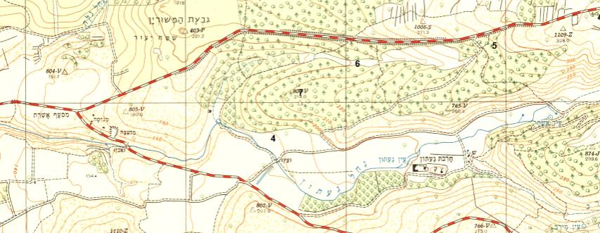 הטופוגרפיה במפה של מילשטיין לא ברורה לי ולא נראה שהוא לקח קילומטר בין המחסומים, גם לא 250מ'. מה שברור, הוא מסמן את המסלול הרגלי מהמחסום הראשון ונראה שהמחסומים דווקא כן מסומנים לקראת ראש התל אחרי הצומת של היום.