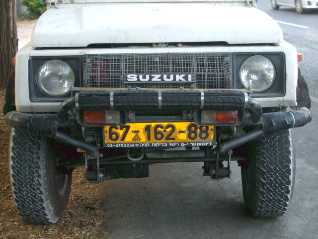 על ה- sj413 נאמר גם שקיבל את ה - sj מ - small jeep . אני לא גדול פיזית , אבל הוא כנראה קטן בכל המובנים . כשעברתי למידת צמיגים 7.00-15 ואחד מארבעת הסטים שלי הוא בגודל שנע בין 30' ל - 31' , צריך למצוא לגלגל הרזרבי מקום ברכב בלי שישבש פונקציו אחרות . בגלל שבמקומו המקורי הסתיר את לוחית הרישוי האחורית , קניתי לוחית מרובעת נוספת .קיבעתי אותה עם מוט 30x30mm מאחוריה , למרכז החישוק ואז צריך לספק גם לה תאורה. אחד היתרונות ב - sj ,הוא שפרט ל - 2 הפנסים הראשים , כל השאר , אתה יכול להרכיב לו כל מה שאתה רוצה/מוצא. הרכבתי לו תאורה ואז כדי לתפוש 2 ציפורים במכה אחת , גם לתת תאורה וגם להגן על הצמיג מהשמש , חתכתי מלבן בכיסוי עבור הלוחית . ( תמונות 1 + 5 ).