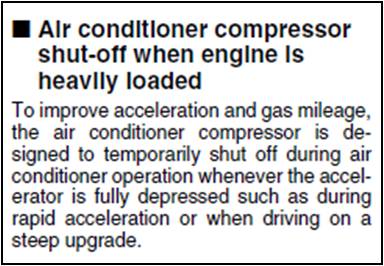ע"פ ספר הרכב, מדחס המזגן מנתק את עצמו כאשר המנוע בעומס גבוה (מה שרשום מתייחס רק למצב בו דוושת הגז לחוצה עד הסוף).