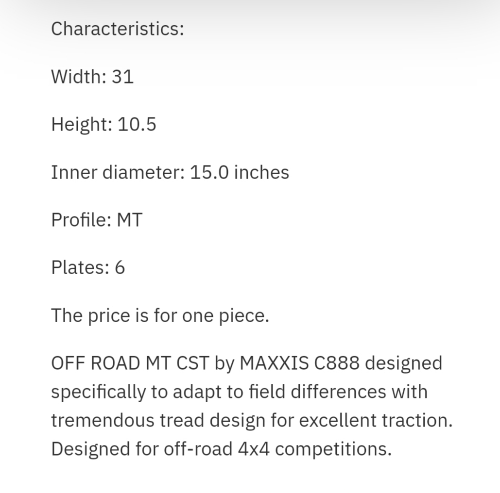 עיון במפרט היצרן מגלה שבמידה 31/10.5R15 הפופולרית, הקוטר שלו בפועל 31.5 על רוחב 11.1.... (כל ה-31ים בשוק למעט טויו MT, הם בפועל 30.5 על פחות מ-10) זה אומר שהוא גדול יותר אפילו מהטויו MT, (שעד כה היה ה-31 בעל הקוטר הגדול ביותר בשוק) ובתכל'ס הוא מקביל בגודלו לצמיגי 32/11.5.