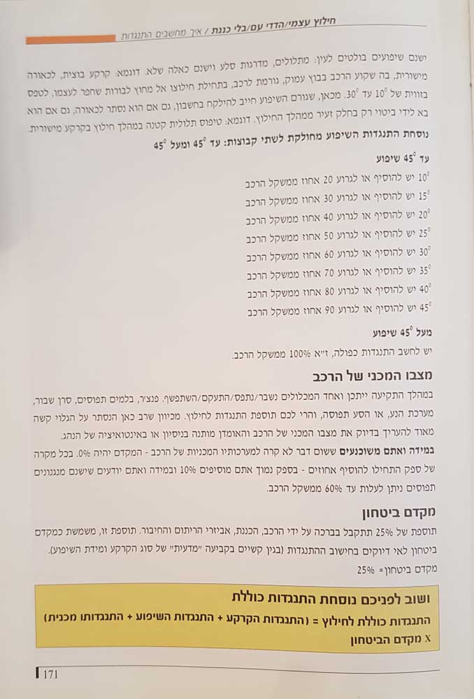 להבדיל מ"התנגדות השיפוע" בעמוד 171 שזה ברור (למרות שהחישוב שלו לא לגמרי ברור אבל אני כנראה חלוד בטריגו. סינוס של 30 מעלות זה חצי, לא 60%, ושל 45 זה 71%, לא 90%?):