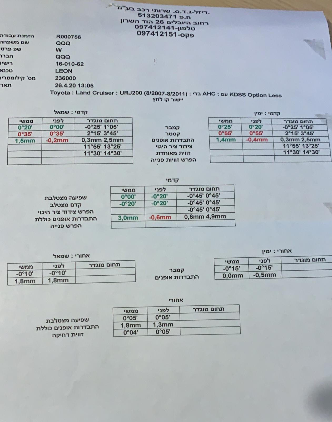 לגבי הסרן האחורי, כמו שנאמר, ברכב כזה אין מה לכוון, אבל הבדיקה יכולה לזהות שמשהו התעוות או התעקם בכל העסק. הקמבר נראה פיקס, ההתבדקות toe in לא סימטרית אבל אני מעריך, לא בוודאות, שזה זניח.
