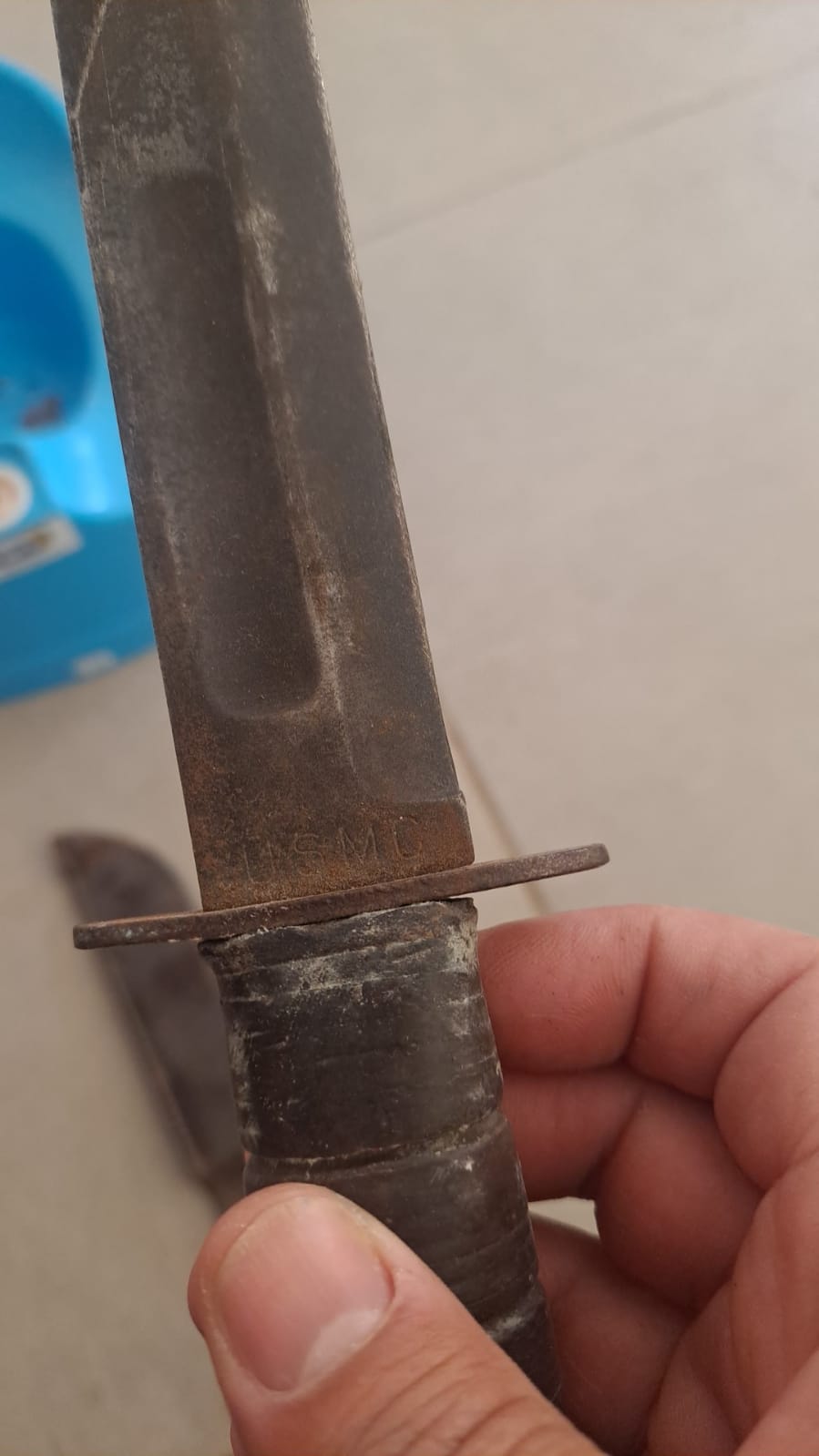 בצד אחד, בין הלהב לידית כתוב: USMC ובצד השני כתוב: KABAR (או משהו דומה).