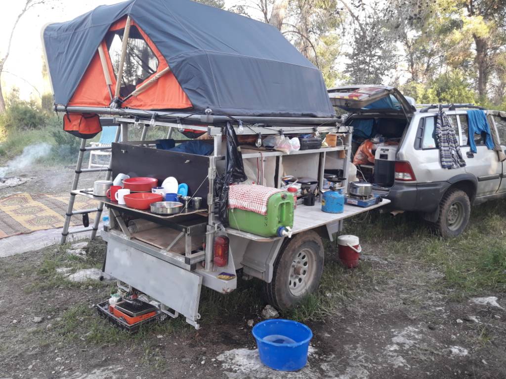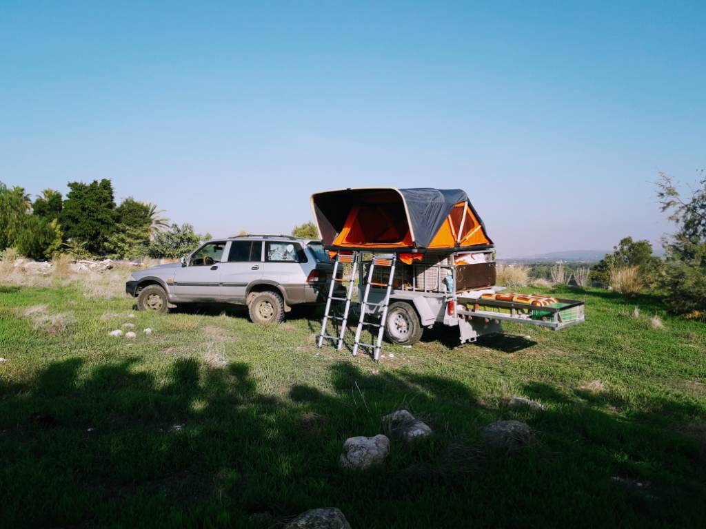 מה שהיה חסר לנו זה אוהל גג נורמלי אז נמצא משהו ביד 2 בזול, נבנתה קונסטרוקציית הגבהה משאריות על הנגרר והאוהל הותקן. האוהל מתאים בול כי הגודל שלו כשהוא מקופל זהה לשטח הנגרר.