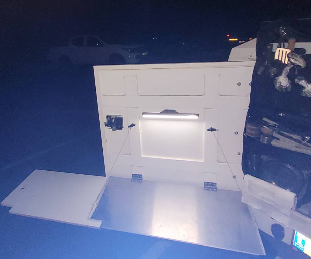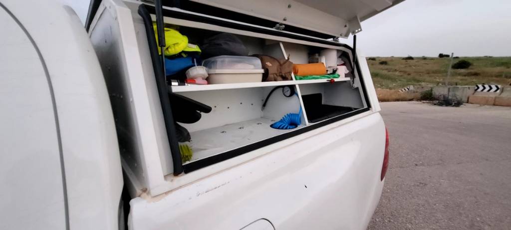 סגירת אלומיניום (אוהל, כיסאות ציוד שינה וכו) מעל הארגז עם ארגזי ציוד בצדדים (כל הציוד שצריך בשלוף, ציוד חילוץ, מטבח, תאורה וציוד אישי), גגון ממעל (עצים, פסולת ושונות).
