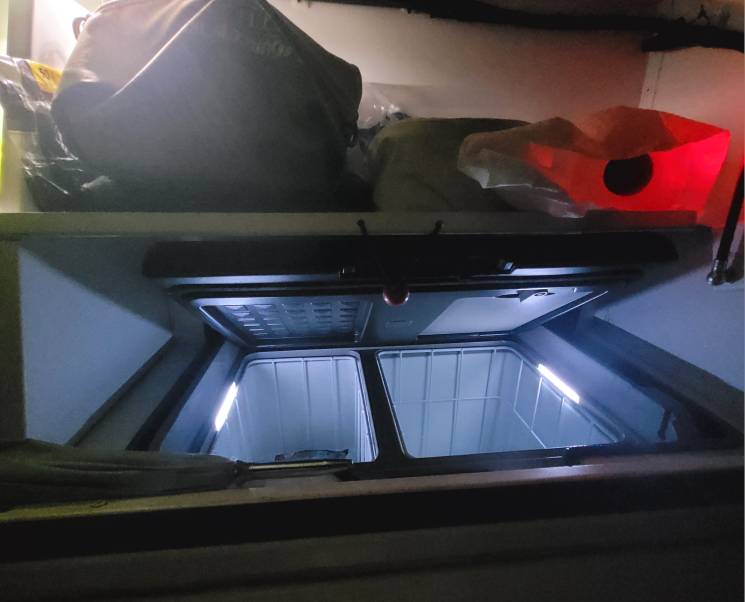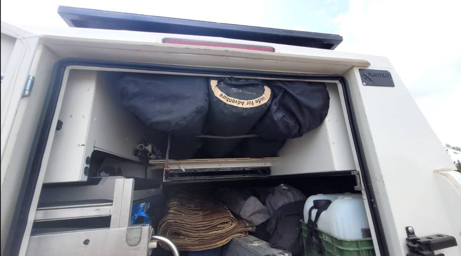 מחיצת עץ פשוטה, מעליה ציוד שינה קל, ממתחת מעוגן שולחן שנשלף בקלות גם כשהארגז עמוס.. שולחן בדכ נשלף ראשון ועולה אחרון לכן זה שיפצור חשוב לטעמי, וממול ברצועה פשוטה ניתן להצמיד ציוד קל לגג מבפנים.