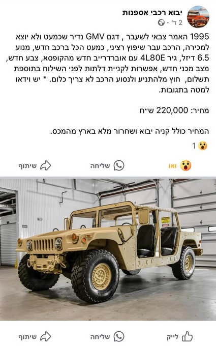 לשאלה המקורית, אפשר לייבא האמר לארץ, ויש לפחות אחד שמתגלגל כבר עם רישוי אספנות.
