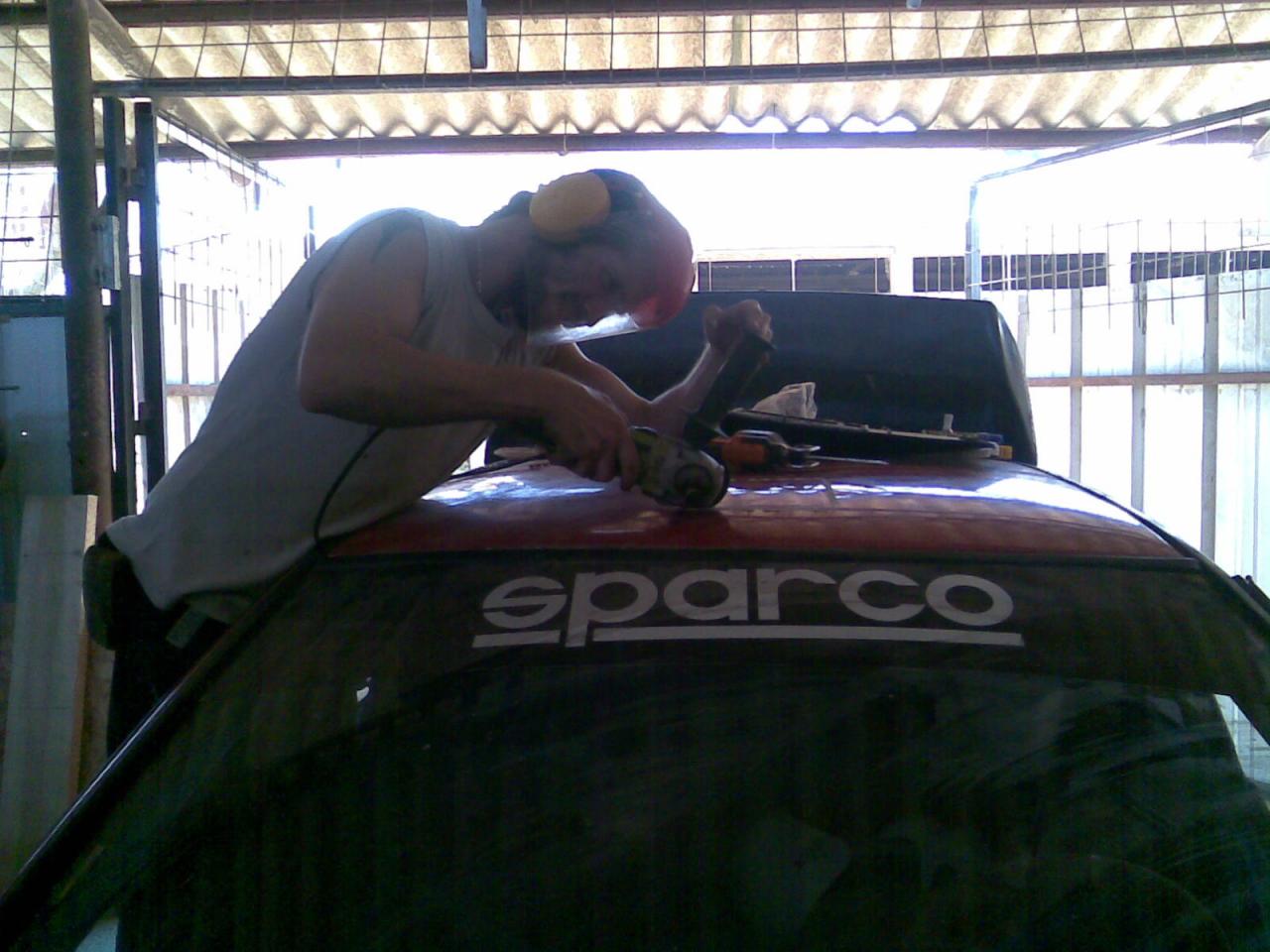 הוא השתחל בין צינורת הכלוב וציפה את החלון האחורי וחלונות הצד בציפויים בכהות שונה. (לפי התקנון חייבים להיות מסוגלים לראות את הנהג מבעד חלון הצד באופן ברור אז לא יכלתי להשחיר את כל החלונות באותה מידה שהשחרתי את החלון האחורי.