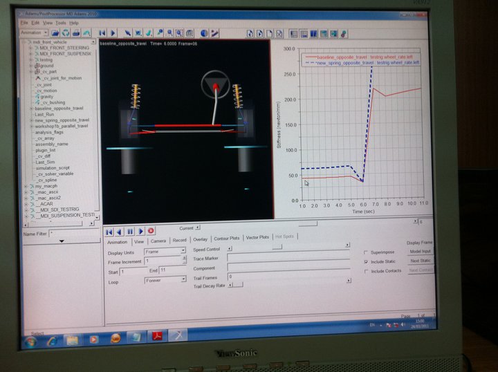 עוד קצת עדכונים ותמונות. לאחרונה כמה מחברי הקבוצה (ואני בינהם - הרווחתי) משתתפים בקורס להכרת התוכנה אדמס\קאר. למי שלא מכיר זוהי תוכנה שמתמחה בחישובים שונים של דינמיקה של גופים. במילים אחרות אפשר להריץ בתוכנה סימולציות שונות להתנהגות של רכב, ברמה מאוד גבוהה. התוכנה מאפשרת כיוונון של הרכב עד לרמת הדפלקציה של הצמיג בסיבוב, עיוות של זרועות מתלה כתוצאה ממאמצים, שינוי מקדם הריסון של מיסבי ההחלקה של המתלה ('בוקסות' בעברית) ועוד ועוד. פשוט תוכנה מדהימה שיכולה לקצר תהליכי ייצור של אבי טיפוס וניסוי וטעיה בהמון.